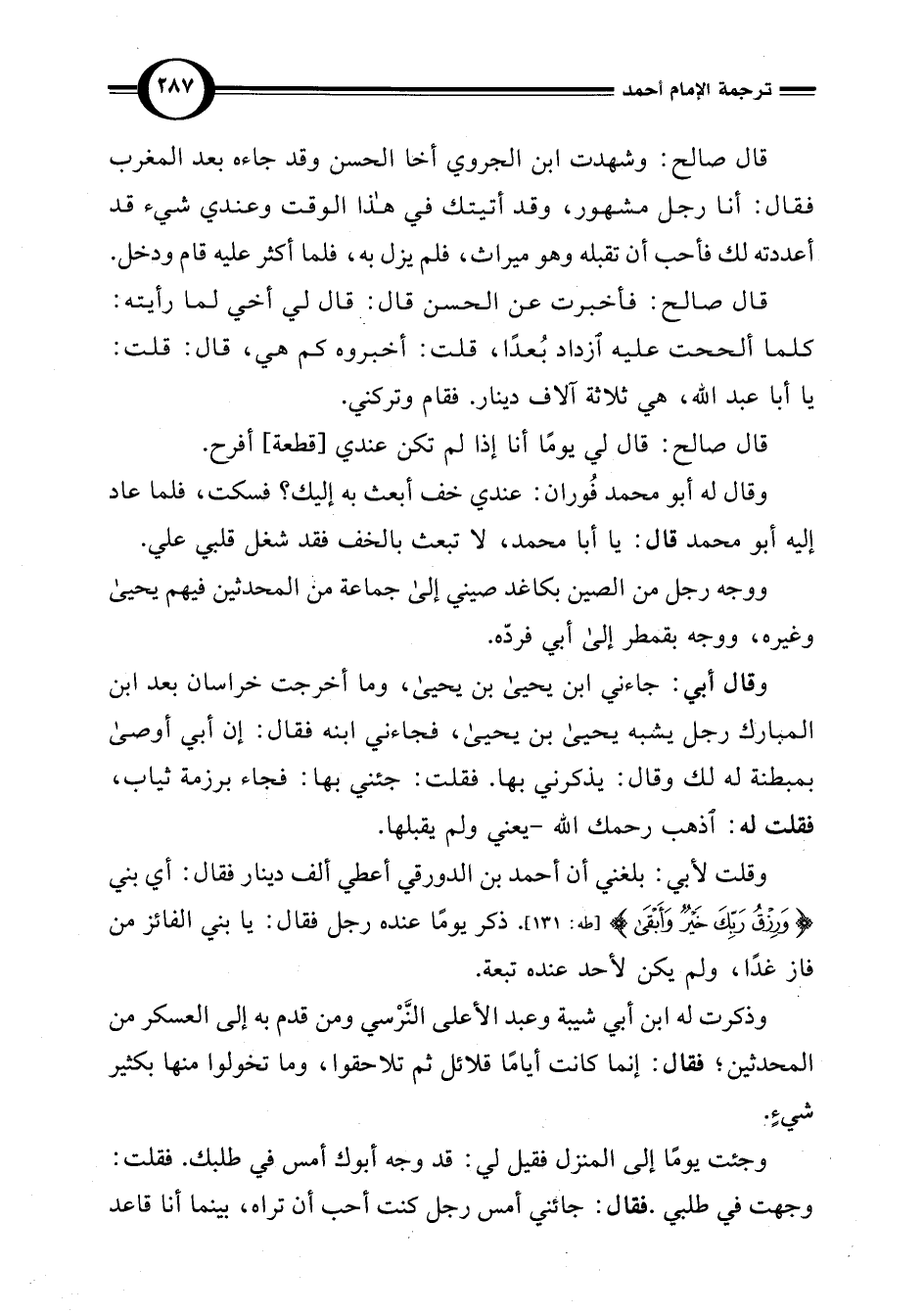 وقلت لأبي: بلغني أن أحمد بن الدورقي أعطي ألف دينار فقال: أي بني {وَرِزْقُ رَبِّكَ خَيْرٌ وَأَبْقَى} [طه: 131]. ذكر يومًا عنده رجل فقال: يا بني الفائز من فاز غدًا، ولم يكن لأحد عنده تبعة.