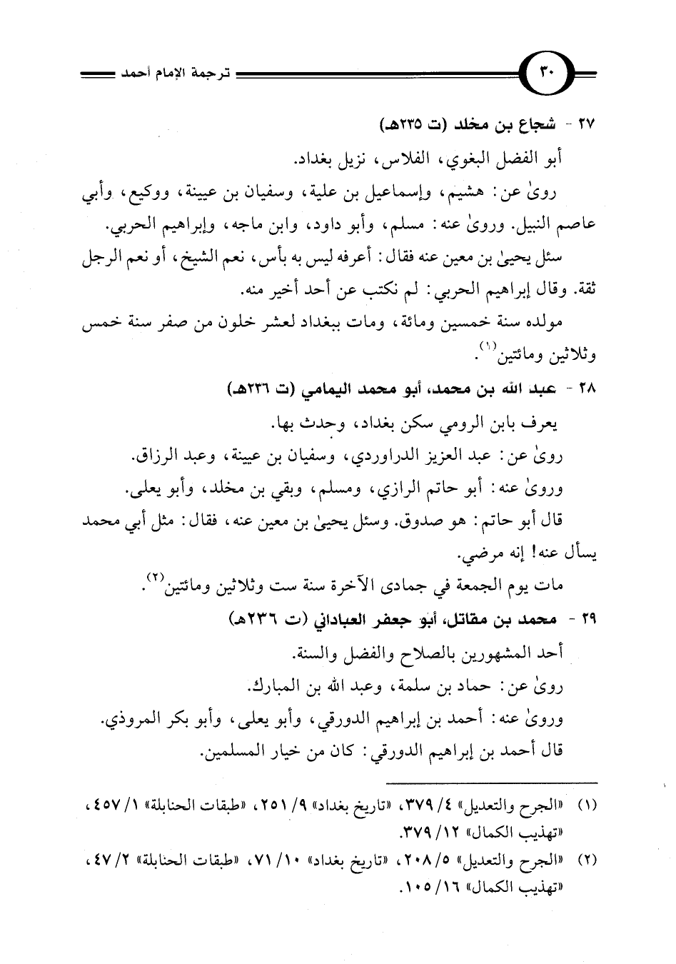 (¬1) "الجرح والتعديل" 4/ 379، "تاريخ بغداد" 9/ 251، "طبقات الحنابلة" 1/ 457، "تهذيب الكمال" 12/ 379.