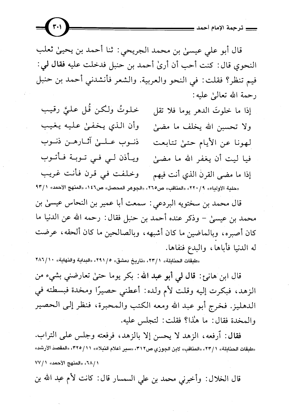 "طبقات الحنابلة" 1/ 23، "المناقب" لابن الجوزي ص 312، "سير أعلام النبلاء" 11/ 325، "المقصد الأرشد" 1/ 68، "المنهج الأحمد" 1/ 77