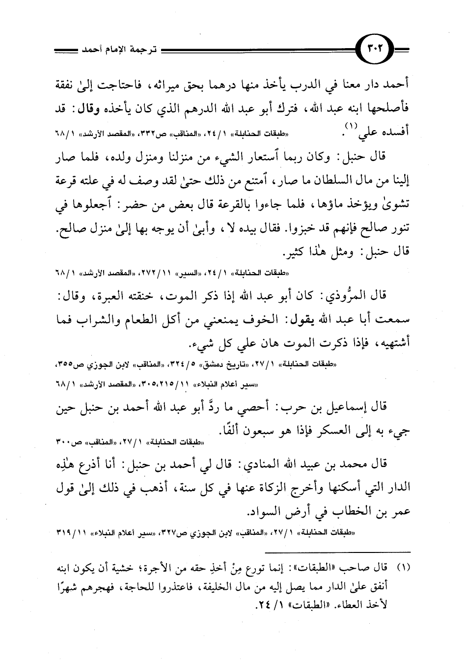 (¬1) قال صاحب "الطبقات": إنما تورع مِنْ أخذِ حقه من الأجرة؛ خشية أن يكون ابنه أنفق على الدار مما يصل إليه من مال الخليفة، فاعتذروا للحاجة، فهجرهم شهرًا لأخذ العطاء. "الطبقات" 1/ 24.