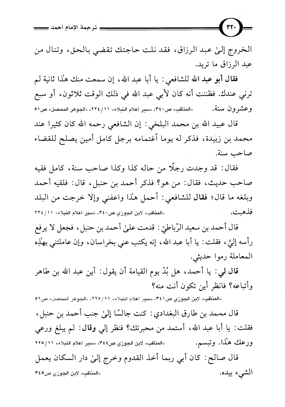 "المناقب" ص 340، "سير أعلام النبلاء" 11/ 224، "الجوهر المحصل" ص 51