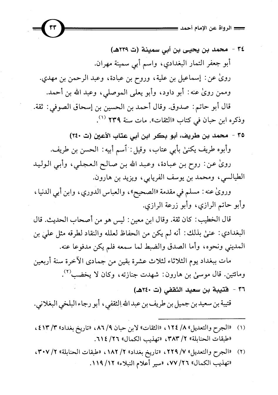 (¬1) "الجرح والتعديل" 8/ 124، "الثقات" لابن حبان 9/ 86، "تاريخ بغداد" 3/ 413، "طبقات الحنابلة" 2/ 383، "تهذيب الكمال" 26/ 614.