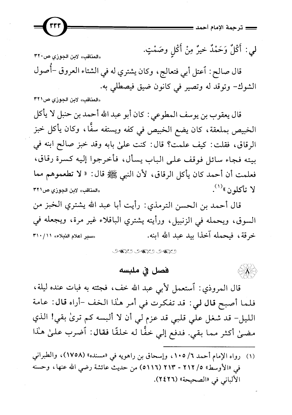 قال يعقوب بن يوسف المطوعي: كان أبو عبد اللَّه أحمد بن حنبل لا يأكل الخبيص بملعقة، كان يضع الخبيص في كفه ويستفه سفًّا، وكان يأكل خبز الرقاق، فقلت: كيف علمت؟ قال: كنت على بابه وقد خبز صالح ابنه في بيته فجاء سائل فوقف على الباب يسأل، فأخرجوا إليه كسرة رقاق، فعلمت أن أحمد كان يأكل الرقاق، لأن النبي -صلى اللَّه عليه وسلم- قال: "لا تطعموهم مما لا تأكلون" (¬1).
