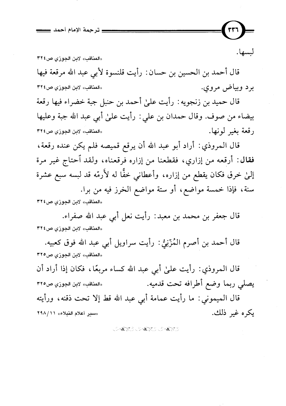 قال حميد بن زنجويه: رأيت على أحمد بن حنبل جبة خضراء فيها رقعة بيضاء من صوف. وقال حمدان بن علي: رأيت على أبي عبد اللَّه جبة وعليها رقعة بغير لونها.