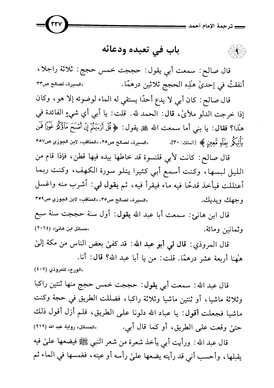 قال صالح: سمعت أبي يقول: حججت خمس حجج: ثلاثة راجلا، أنفقتُ في إحدى هذِه الحجج ثلاثين درهمًا.
