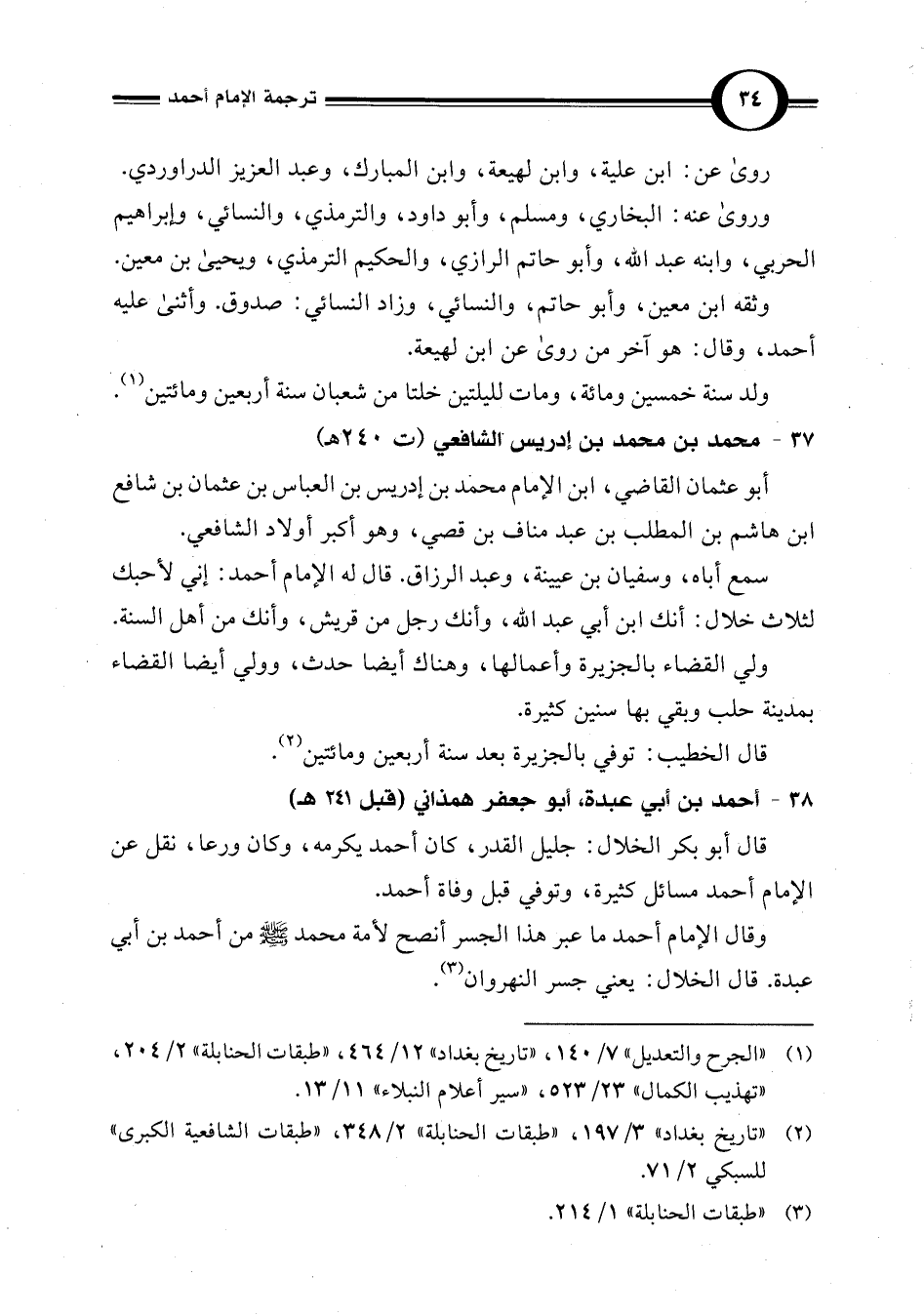 (¬2) "تاريخ بغداد" 3/ 197، "طبقات الحنابلة" 2/ 348، "طبقات الشافعية الكبرى" للسبكي 2/ 71.