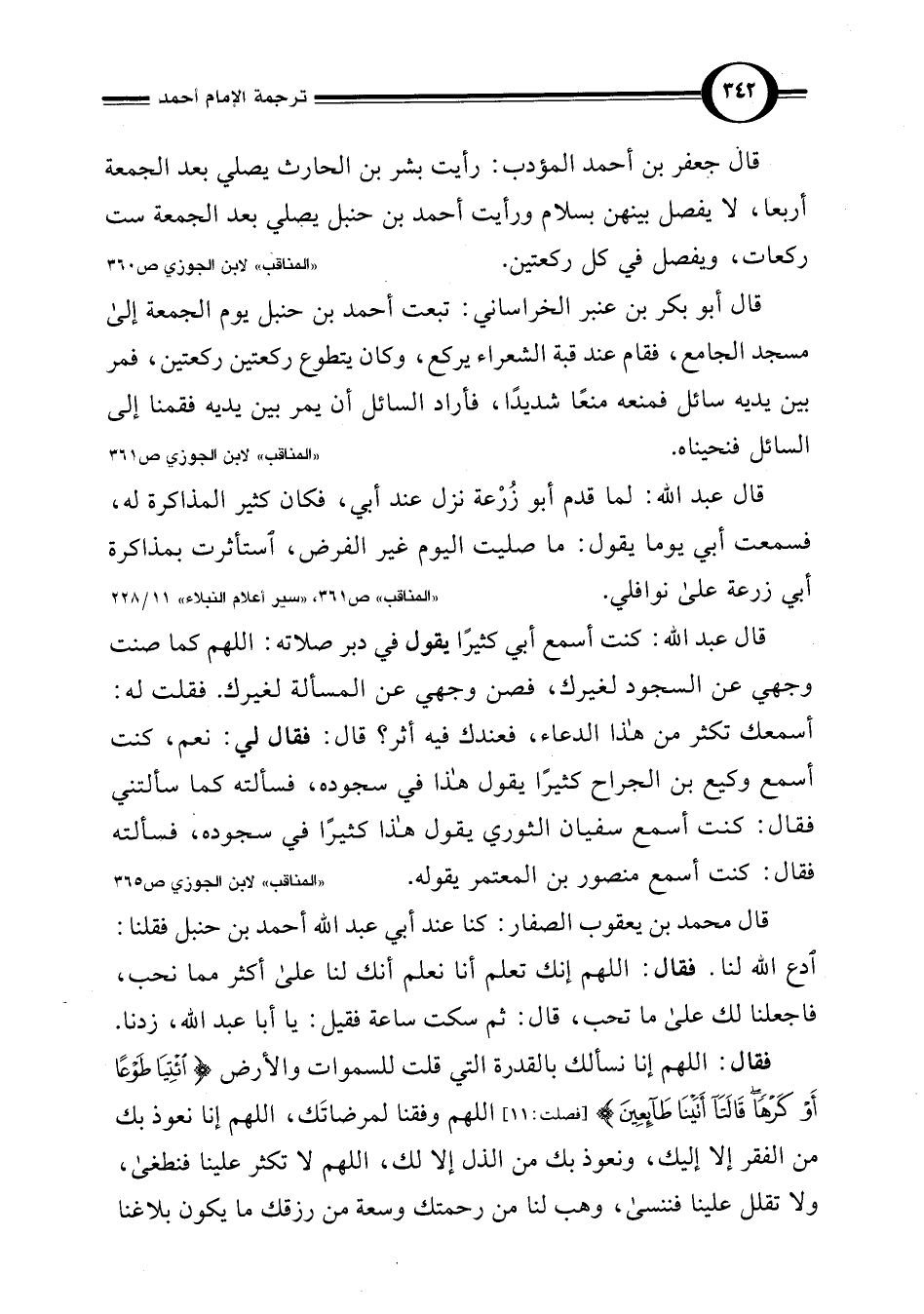 قال عبد اللَّه: كنت أسمع أبي كثيرًا يقول في دبر صلاته: اللهم كما صنت وجهي عن السجود لغيرك، فصن وجهي عن المسألة لغيرك. فقلت له: أسمعك تكثر من هذا الدعاء، فعندك فيه أثر؟ قال: فقال لي: نعم، كنت أسمع وكيع بن الجراح كثيرًا يقول هذا في سجوده، فسألته كما سألتني فقال: كنت أسمع سفيان الثوري يقول هذا كثيرًا في سجوده، فسألته فقال: كنت أسمع منصور بن المعتمر يقوله.