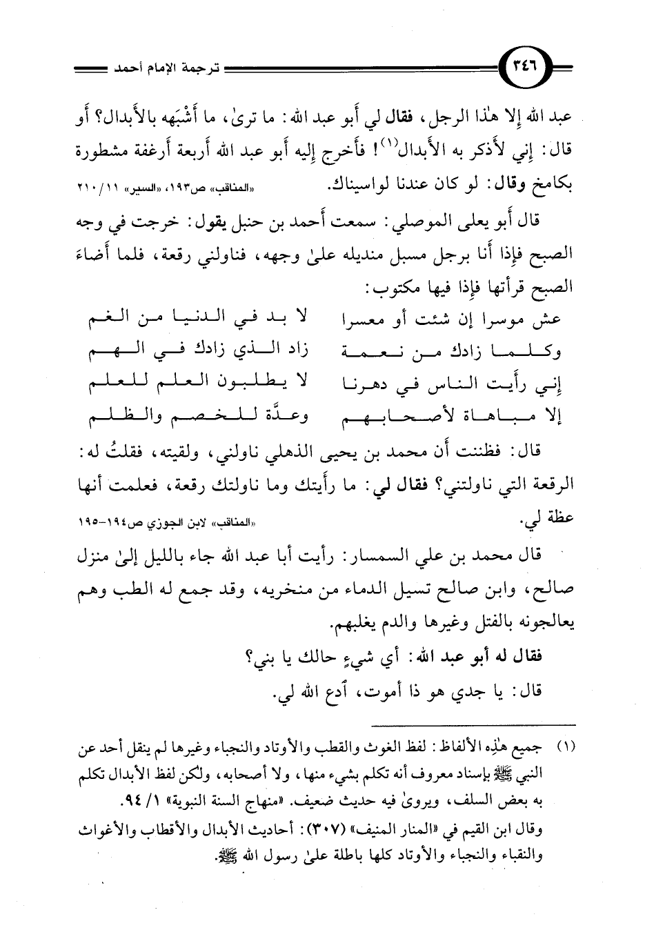 قال أَبو يعلى الموصلي: سمعت أَحمد بن حنبل يقول: خرجت في وجه الصبح فإِذا أَنا برجل مسبل منديله على وجهه، فناولني رقعة، فلما أَضاءَ الصبح قرأتها فإِذا فيها مكتوب: