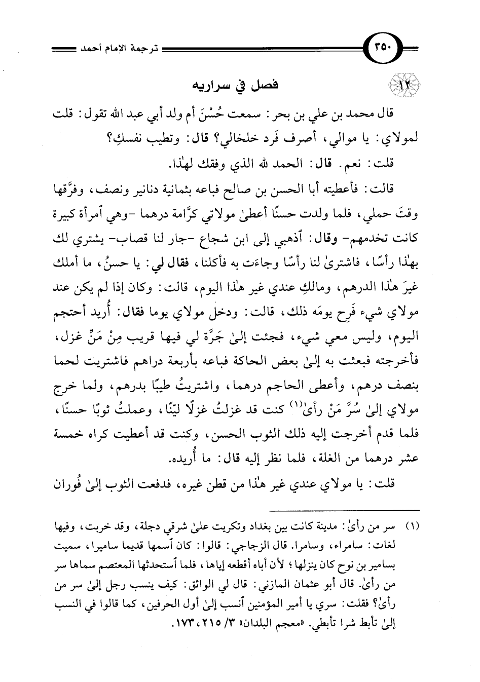 (¬1) سر من رأى: مدينة كانت بين بغداد وتكريت على شرقي دجلة، وقد خربت، وفيها لغات: سامراء، وسامرا. قال الزجاجي: قالوا: كان اسمها قديما ساميرا، سميت بسامير بن نوح كان ينزلها؛ لأن أباه أقطعه إياها، فلما استحدثها المعتصم سماها سر من رأى. قال أبو عثمان المازني: قال لي الواثق: كيف ينسب رجل إلى سر من رأى؟ فقلت: سري يا أمير المؤمنين انسب إلى أول الحرفين، كما قالوا في النسب إلى تأبط شرا تأبطي. "معجم البلدان" 3/ 215، 173.