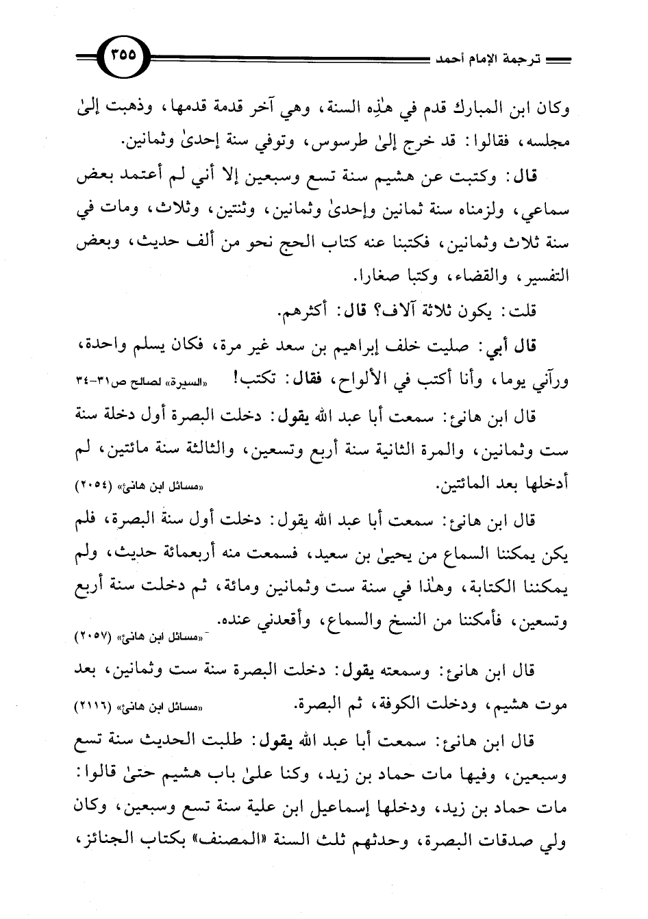 قال ابن هانئ: سمعت أبا عبد اللَّه يقول: طلبت الحديث سنة تسع وسبعين، وفيها مات حماد بن زيد، وكنا على باب هشيم حتى قالوا: مات حماد بن زيد، ودخلها إسماعيل ابن علية سنة تسع وسبعين، وكان ولي صدقات البصرة، وحدثهم ثلث السنة "المصنف" بكتاب الجنائز،
