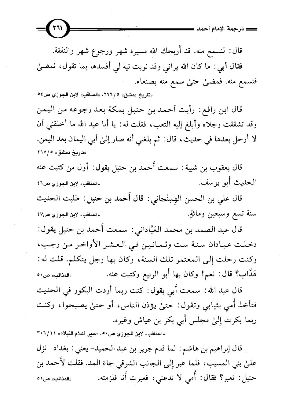 قال عبد اللَّه: سمعت أَبي يقول: كنت ربما أردت البكور في الحديث فتأخذ أُمي بثيابي وتقول: حتى يؤذن الناس، أو حتى يصبحوا، وكنت ربما بكرت إِلى مجلس أَبي بكر بن عياش وغيره.