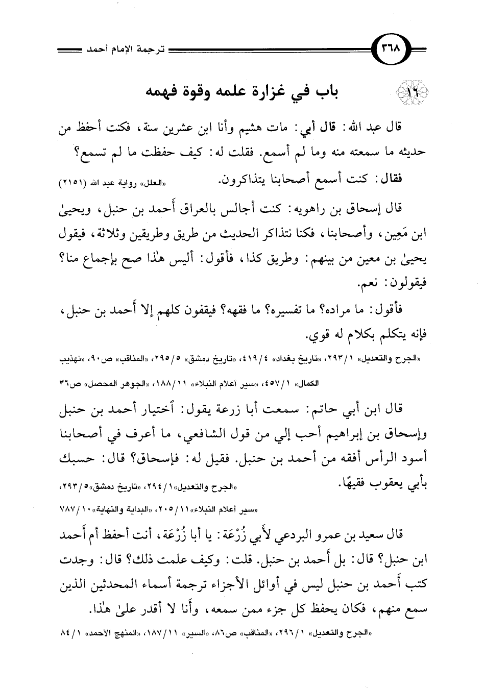 "الجرح والتعديل" 1/ 296، "المناقب" ص 86، "السير" 11/ 187، "المنهج الأحمد" 1/ 84