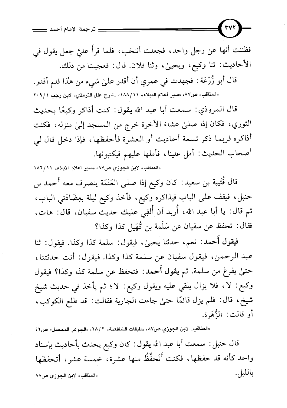 قال قُتَيبة بن سعيد: كان وكيع إذا صلى العَتَمَة ينصرف معه أَحمد بن حنبل، فيقف على الباب فيذاكره وكيع، فأخذ وكيع ليلة بعِضَادَتي الباب، ثم قال: يا أبا عبد اللَّه، أُريد أن أُلقِي عليك حديث سفيان، قال: هات، فقال: تحفظ عن سفيان عن سَلَمة بن كُهَيل كذا وكذا؟ فيقول أَحمد: نعم، حدثنا يحيى، فيقول: سلمة كذا وكذا. فيقول: ثنا عبد الرحمن، فيقول سفيان عن سلمة كذا وكذا. فيقول: أنت حدثتنا، حتى يفرغ من سلمة. ثم يقول أَحمد: فتحفظ عن سلمة كذا وكذا؟ فيقول وكيع: لا، فلا يزال يلقي عليه ويقول وكيع: لا؟ ثم يأخذ في حديث شيخ شيخ، قال: فلم يزل قائمًا حتى جاءت الجارية فقالت: قد طلع الكوكب، أو قالت: الزُّهَرة.