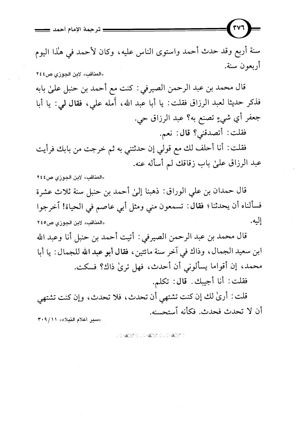 قال محمد بن عبد الرحمن الصيرفي: أتيت أحمد بن حنبل أنا وعبد اللَّه ابن سعيد الجمال، وذاك في آخر سنة مائتين، فقال أبو عبد اللَّه للجمال: يا أبا محمد، إن أقواما يسألوني أن أحدث، فهل ترى ذاك؟ فسكت.