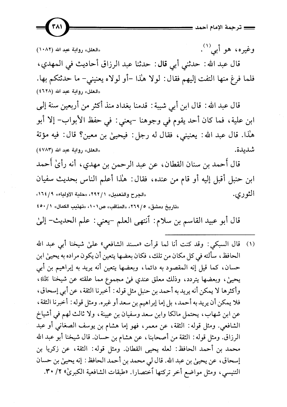 (¬1) قال السبكي: وقد كنت أنا لما قرأت "مسند الشافعي" على شيخنا أبي عبد اللَّه الحافظ، سألته في كل مكان من تلك، فكان بعضها يتعين أن يكون مراده به يحيى ابن حسان، كما قيل إنه المقصود به دائما، وبعضها يتعين أنه يريد به إبراهيم بن أبي يحيى، وبعضها يتردد، وذلك معلق عندي فى مجموع مما علقته عن شيخنا رحمه اللَّه، وأكثرها لا يمكن أنه يريد به أحمد بن حنبل مثل قوله: أخبرنا الثقة، عن أبي إسحاق، فلا يمكن أن يريد به أحمد، بل إما إبراهيم بن سعد أو غيره. ومثل قوله: أخبرنا الثقة، عن ابن شهاب، يحتمل مالكا وابن سعد وسفيان بن عيينة، ولا ثالث لهم في أشياخ الشافعي. ومثل قوله: الثقة، عن معمر، فهو إما هشام بن يوسف الصغاني أو عبد الرزاق. ومثل قوله: الثقة من أصحابنا، عن هشام بن حسان. قال شيخنا أبو عبد اللَّه محمد بن أحمد الحافظ: لعله يحيى القطان. ومثل قوله: الثقة، عن زكريا بن إسحاق، عن يحيى بن عبد اللَّه. قال لي محمد بن أحمد الحافظ: إنه يحيى بن حسان التنيسي، ومثل مواضع أخر تركتها اختصارا. "طبقات الشافعية الكبرى" 2/ 30.