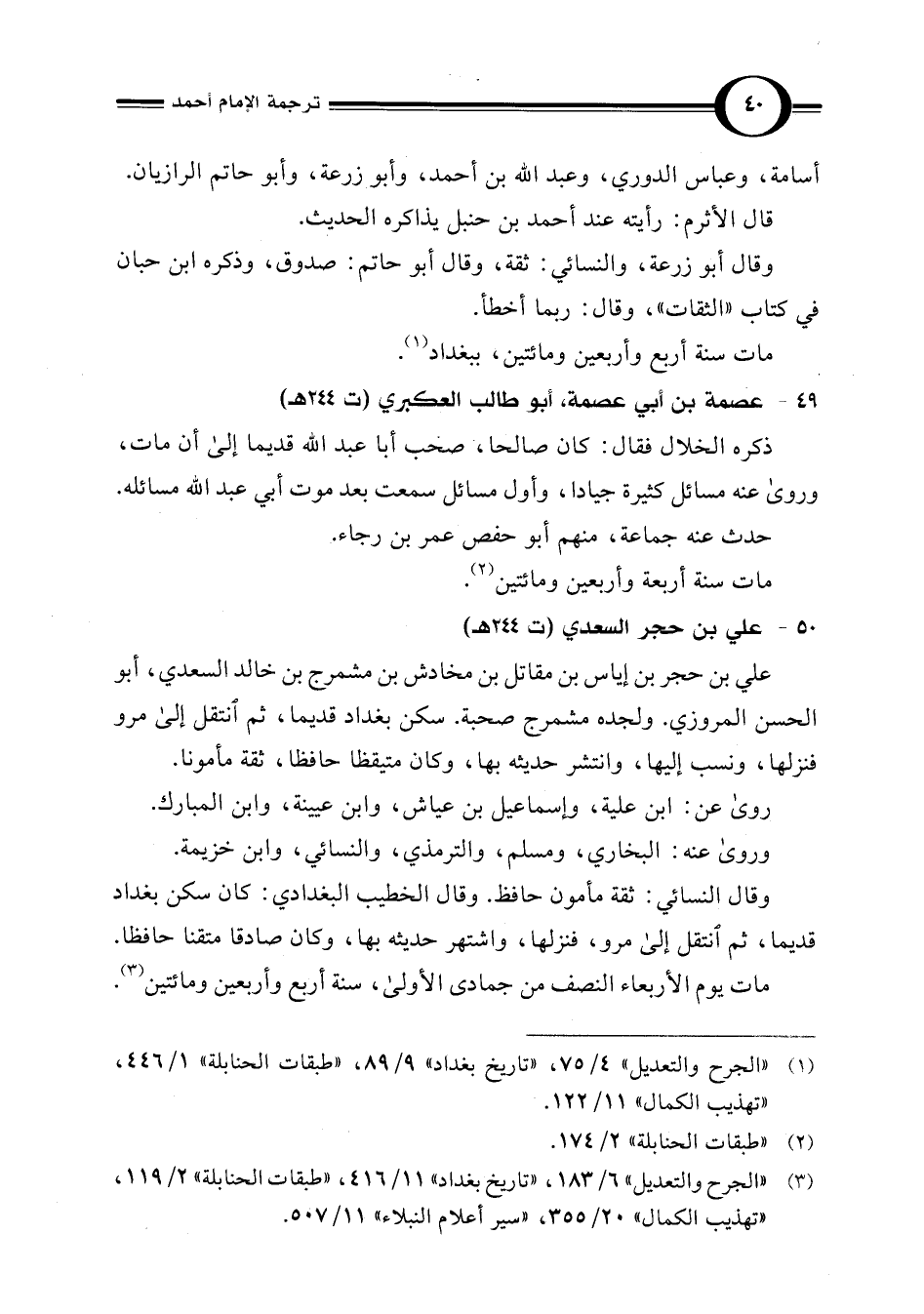 (¬3) "الجرح والتعديل" 6/ 183، "تاريخ بغداد" 11/ 416، "طبقات الحنابلة" 2/ 119، "تهذيب الكمال" 20/ 355، "سير أعلام النبلاء" 11/ 507.