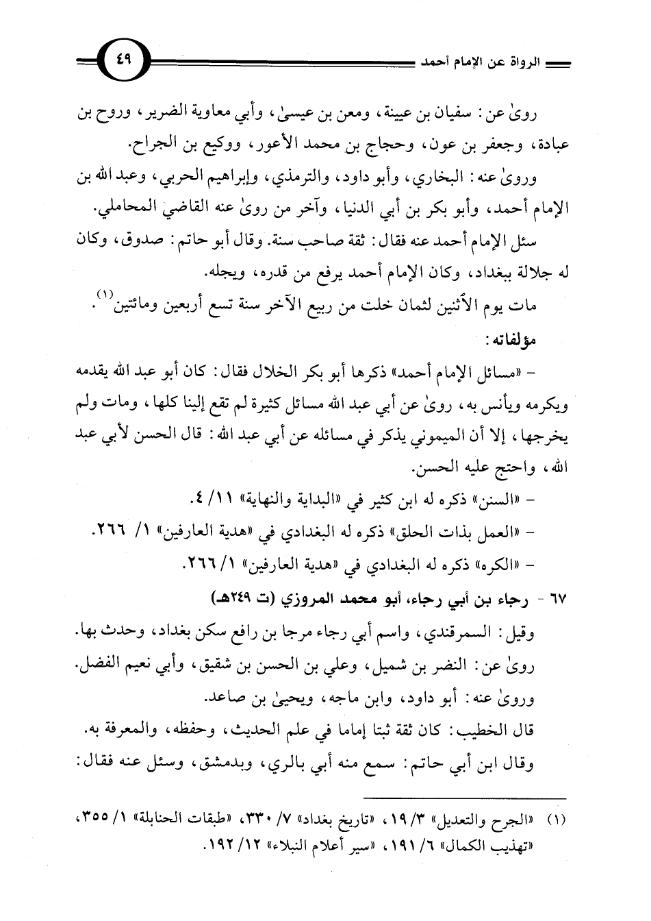 (¬1) "الجرح والتعديل" 3/ 19، "تاريخ بغداد" 7/ 330، "طبقات الحنابلة" 1/ 355، "تهذيب الكمال" 6/ 191، "سير أعلام النبلاء" 12/ 192.