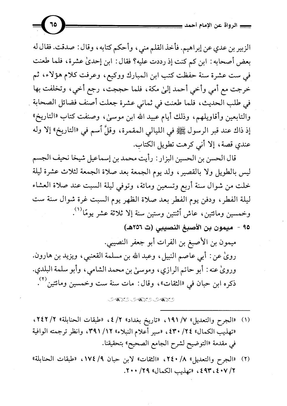 (¬1) "الجرح والتعديل" 7/ 191، "تاريخ بغداد" 2/ 4، "طبقات الحنابلة" 2/ 242، "تهذيب الكمال" 24/ 430، "سير أعلام النبلاء" 12/ 391، وانظر ترجمته الوافية في مقدمة "التوضيح لشرح الجامع الصحيح" بتحقيقنا.