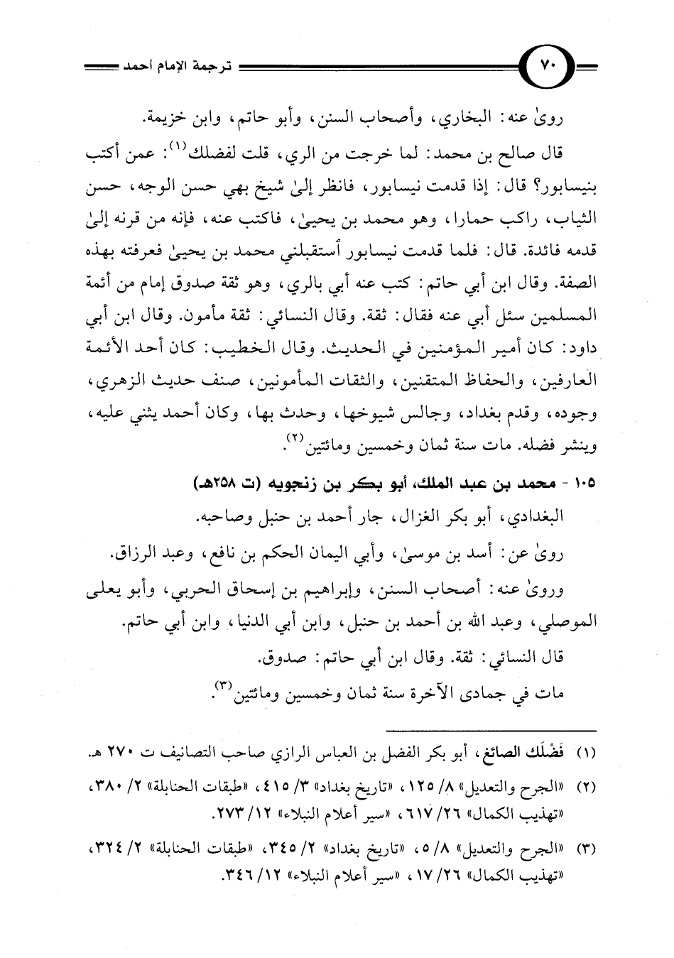 (¬3) "الجرح والتعديل" 8/ 5، "تاريخ بغداد" 2/ 345، "طبقات الحنابلة" 2/ 324، "تهذيب الكمال" 26/ 17، "سير أعلام النبلاء" 12/ 346.