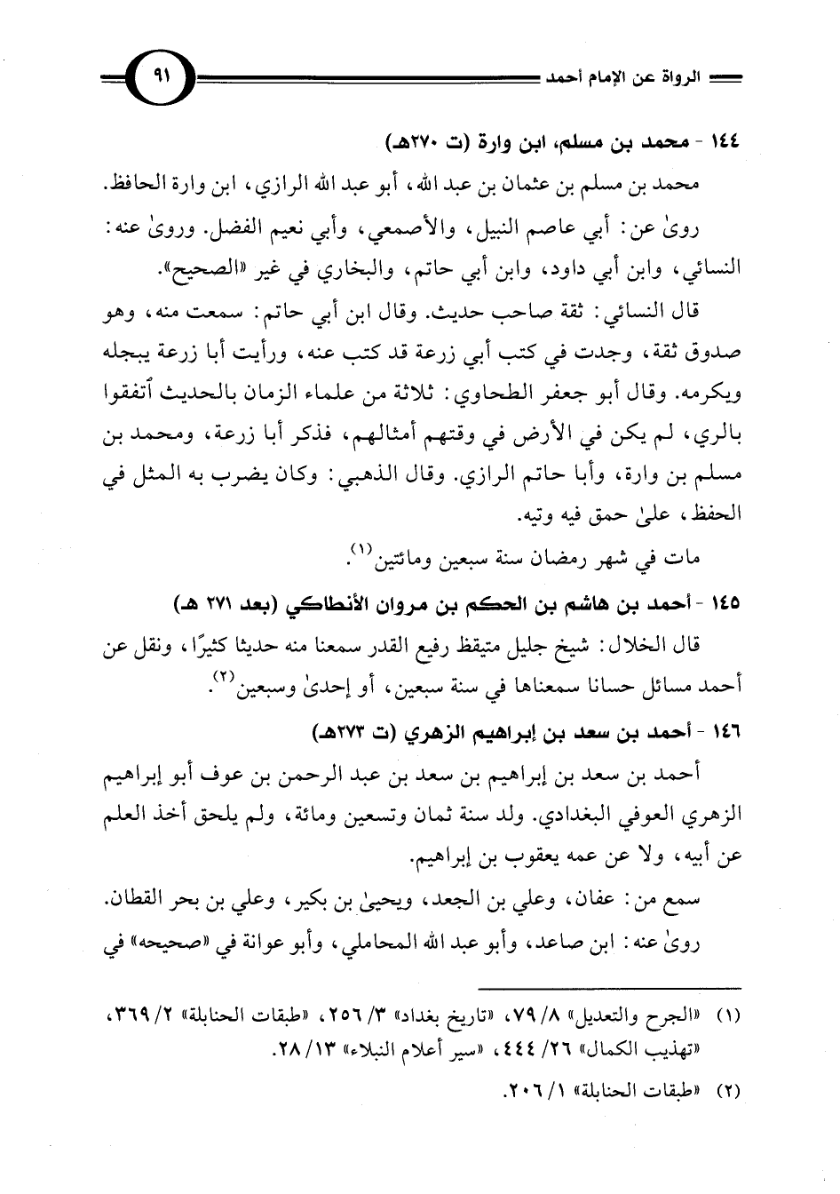 (¬1) "الجرح والتعديل" 8/ 79، "تاريخ بغداد" 3/ 256، "طبقات الحنابلة" 2/ 369، "تهذيب الكمال" 26/ 444، "سير أعلام النبلاء" 13/ 28.