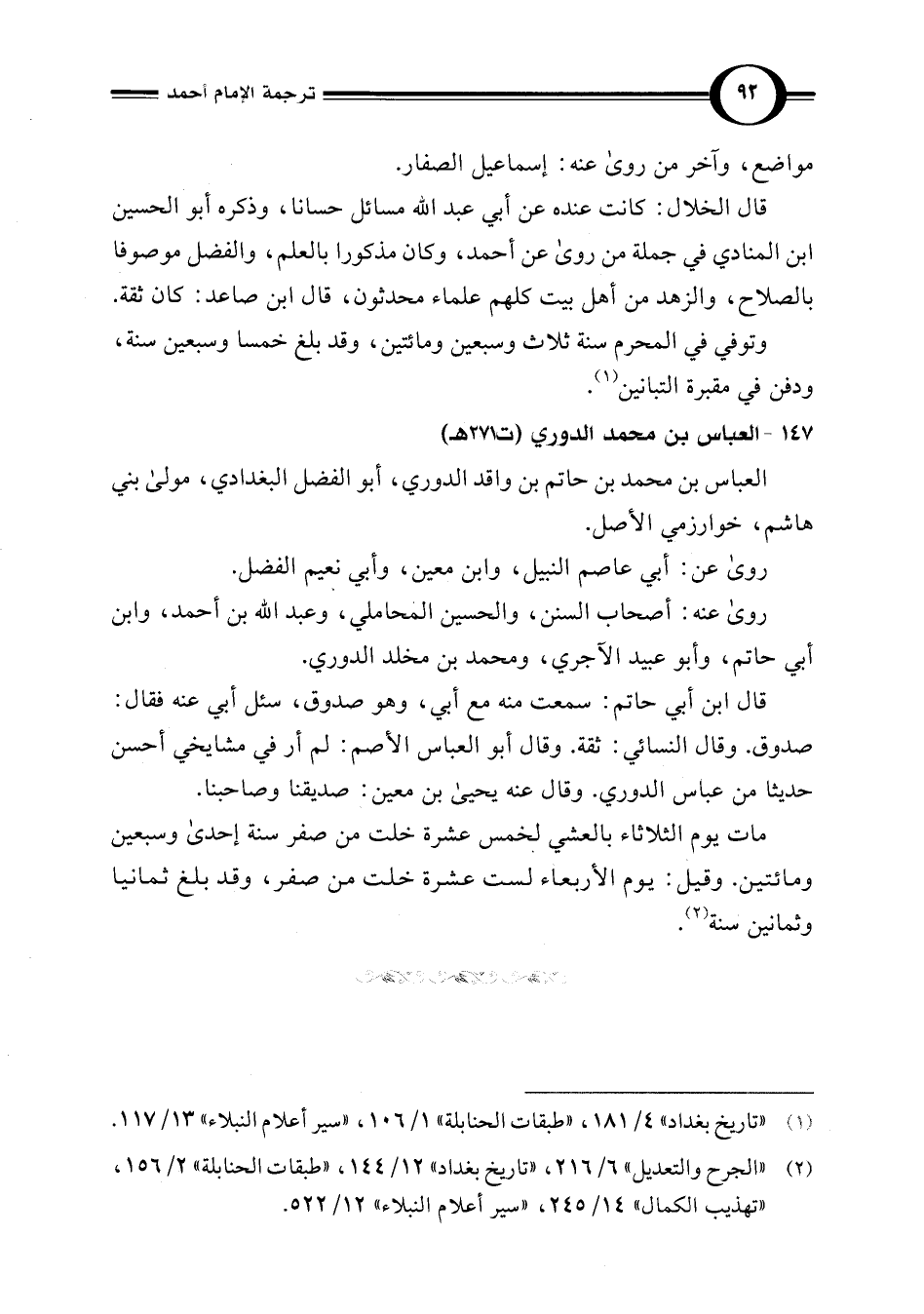 (¬2) "الجرح والتعديل" 6/ 216، "تاريخ بغداد" 12/ 144، "طبقات الحنابلة" 2/ 156، "تهذيب الكمال" 14/ 245، "سير أعلام النبلاء" 12/ 522.