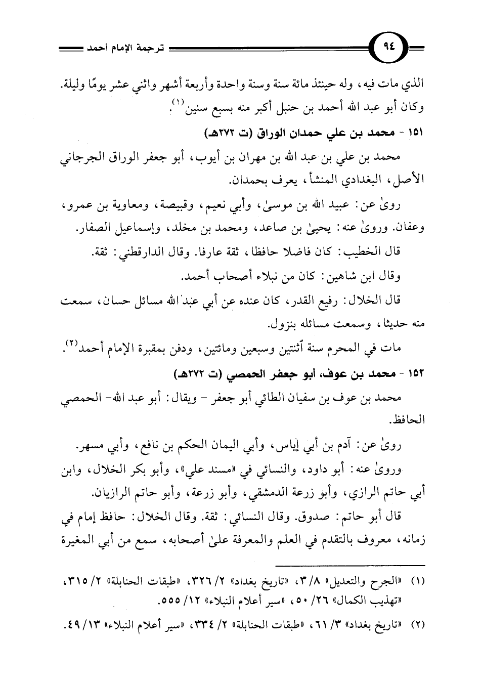 (¬2) "تاريخ بغداد" 3/ 61، "طبقات الحنابلة" 2/ 334، "سير أعلام النبلاء" 13/ 49.