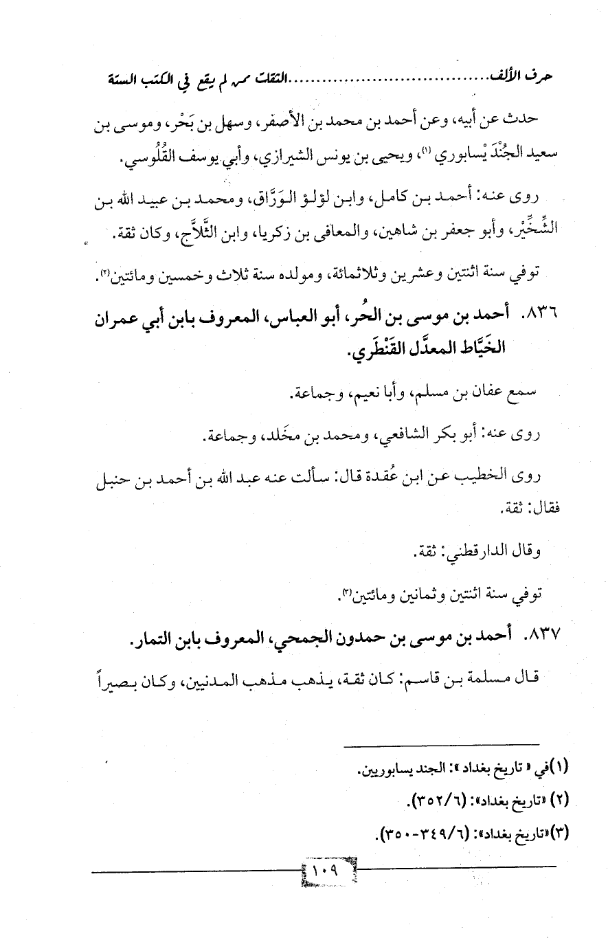 836 - أحمد بن موسى بن الحُر، أبو العباس، المعروف بابن أبي عمران الخَيَّاط المعدَّل القَنْطَري.