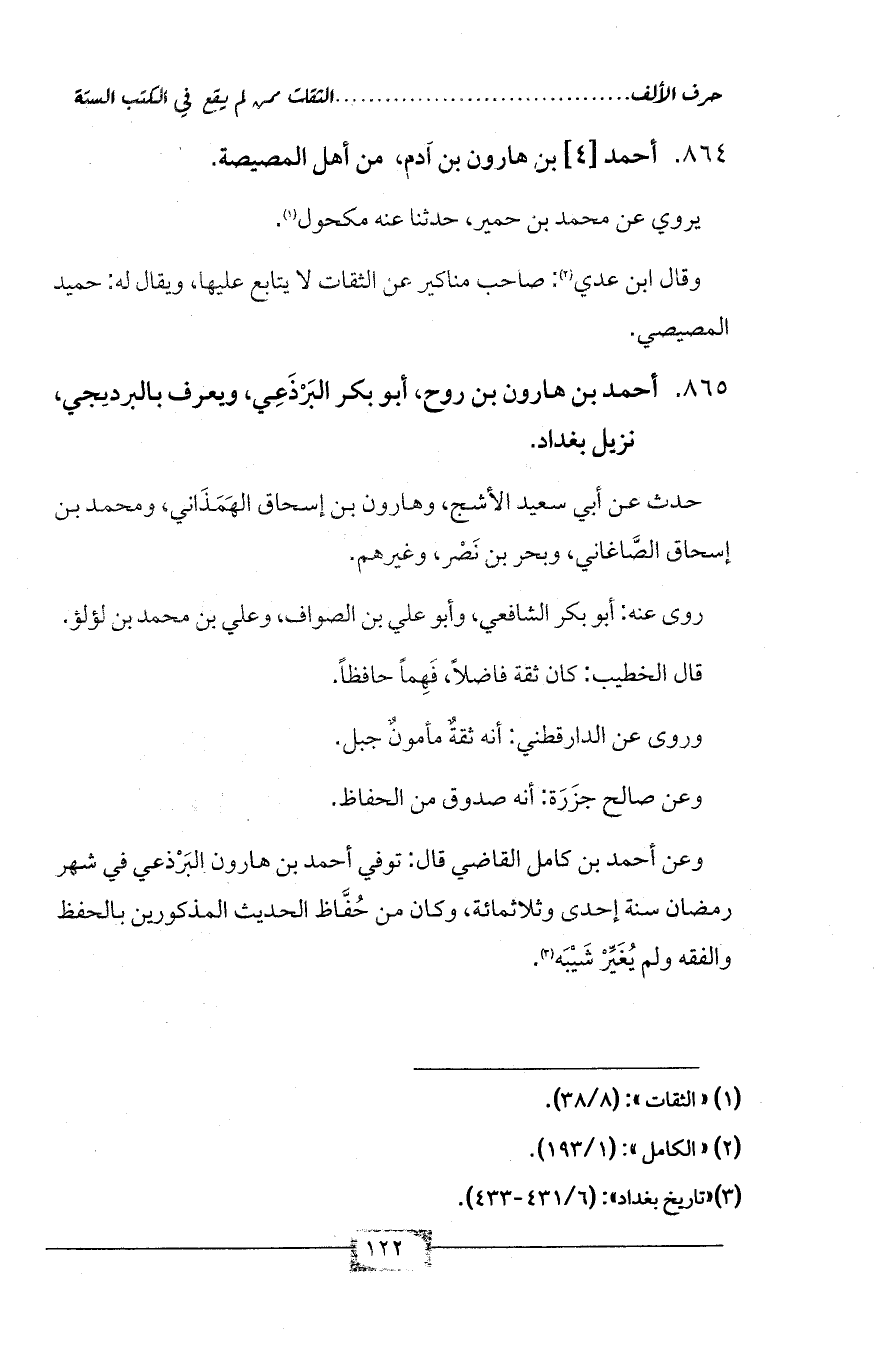 865 - أحمد بن هارون بن روح، أبو بكر البَرْذَعِي، ويعرف بالبرديجي، نزيل بغداد.