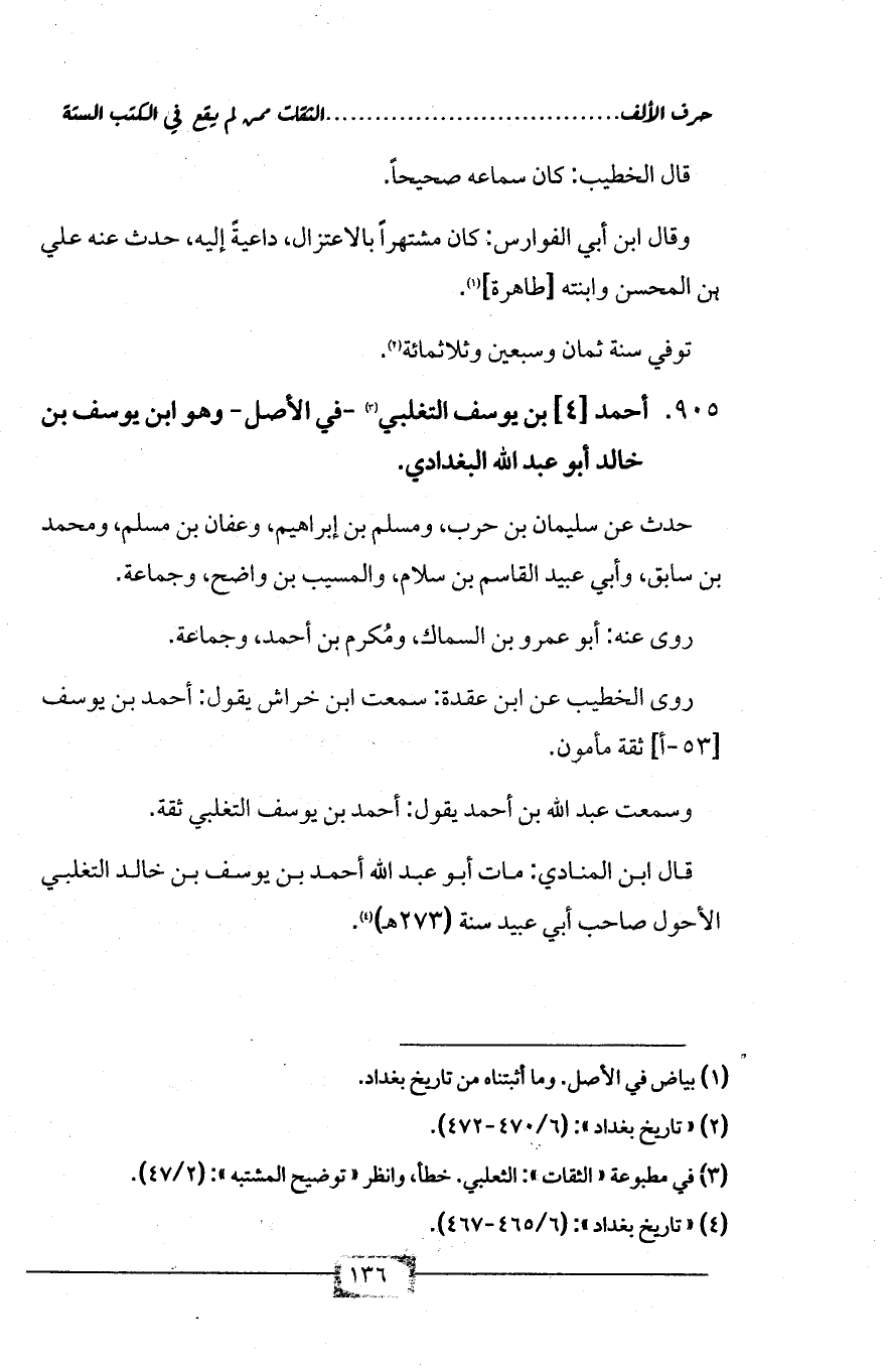 905 - أحمد [4] بن يوسف التغلبي (¬3) -في الأصل- وهو ابن يوسف بن خالد أبو عبد الله البغدادي.