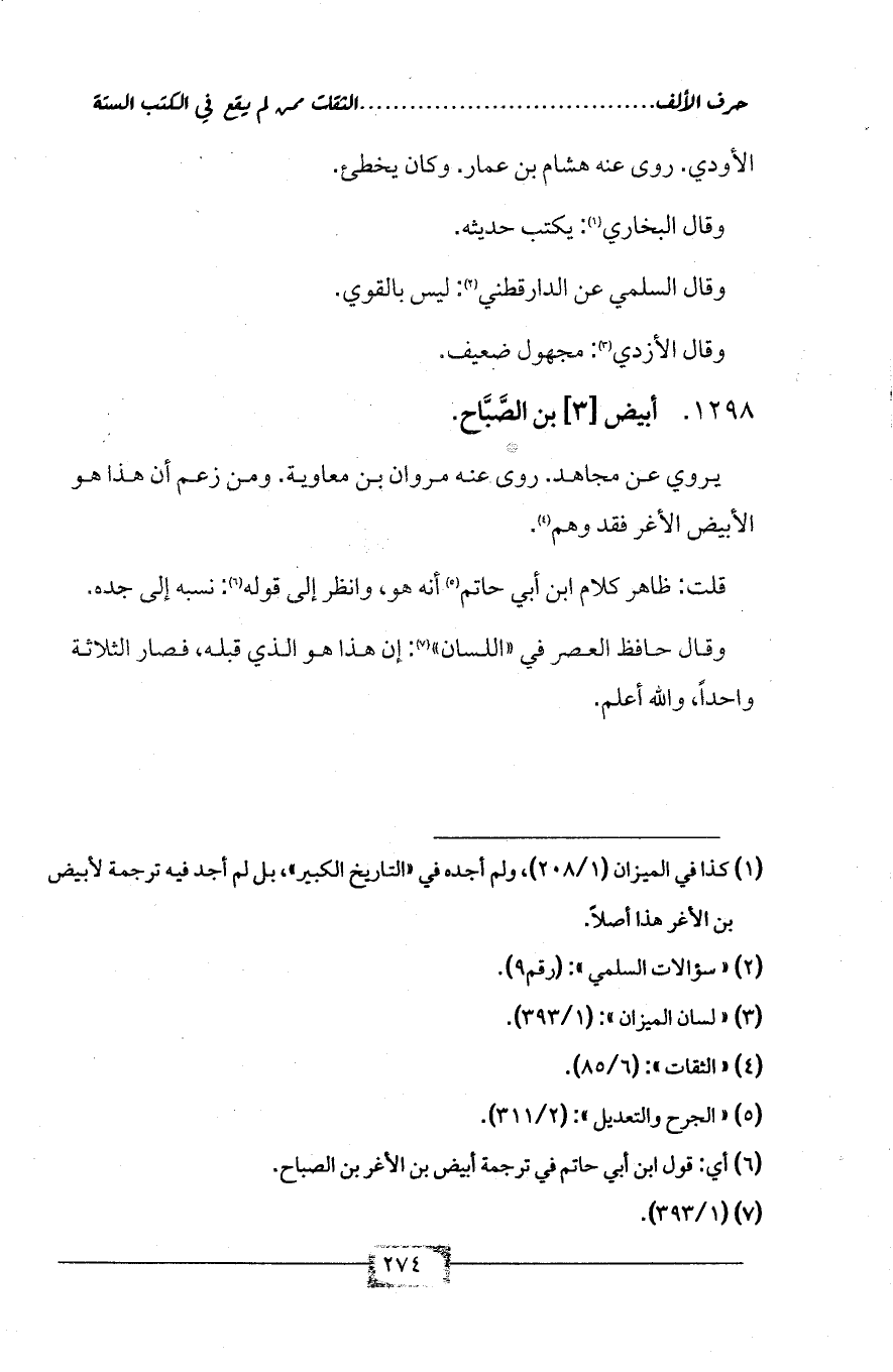 (¬1) كذا في الميزان (1/ 208)، ولم أجده في «التاريخ الكبير»، بل لم أجد فيه ترجمة لأبيض بن الأغر هذا أصلاً.