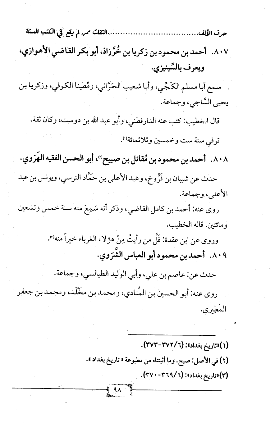 807 - أحمد بن محمود بن زكريا بن خُرَّزاذ، أبو بكر القاضي الأهوازي، ويعرف بالسِّينيزي.
