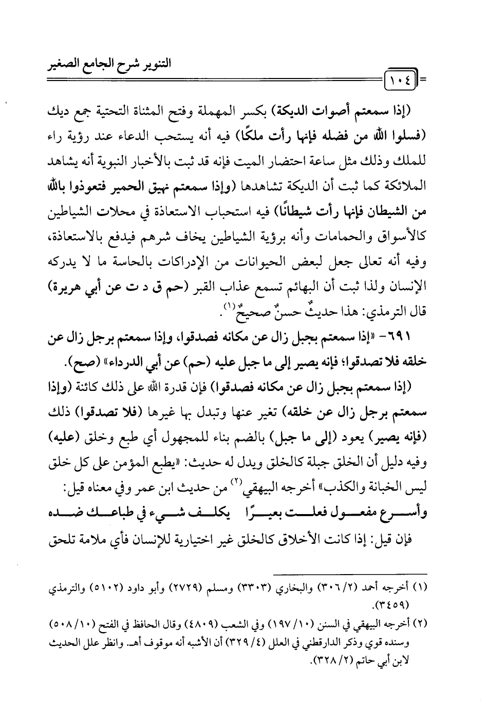 (إذا سمعتم أصوات الديكة) بكسر المهملة وفتح المثناة التحتية جمع ديك (فسلوا الله من فضله فإنها رأت ملكًا) فيه أنه يستحب الدعاء عند رؤية راء للملك وذلك مثل ساعة احتضار الميت فإنه قد ثبت بالأخبار النبوية أنه يشاهد الملائكة كما ثبت أن الديكة تشاهدها (وإذا سمعتم نهيق الحمير فتعوذوا بالله من الشيطان فإنها رأت شيطانًا) فيه استحباب الاستعاذة في محلات الشياطين كالأسواق والحمامات وأنه برؤية الشياطين يخاف شرهم فيدفع بالاستعاذة، وفيه أنه تعالى جعل لبعض الحيوانات من الإدراكات بالحاسة ما لا يدركه الإنسان ولذا ثبت أن البهائم تسمع عذاب القبر (حم ق د ت عن أبي هريرة) قال الترمذي: هذا حديثٌ حسنٌ صحيحٌ (¬1).