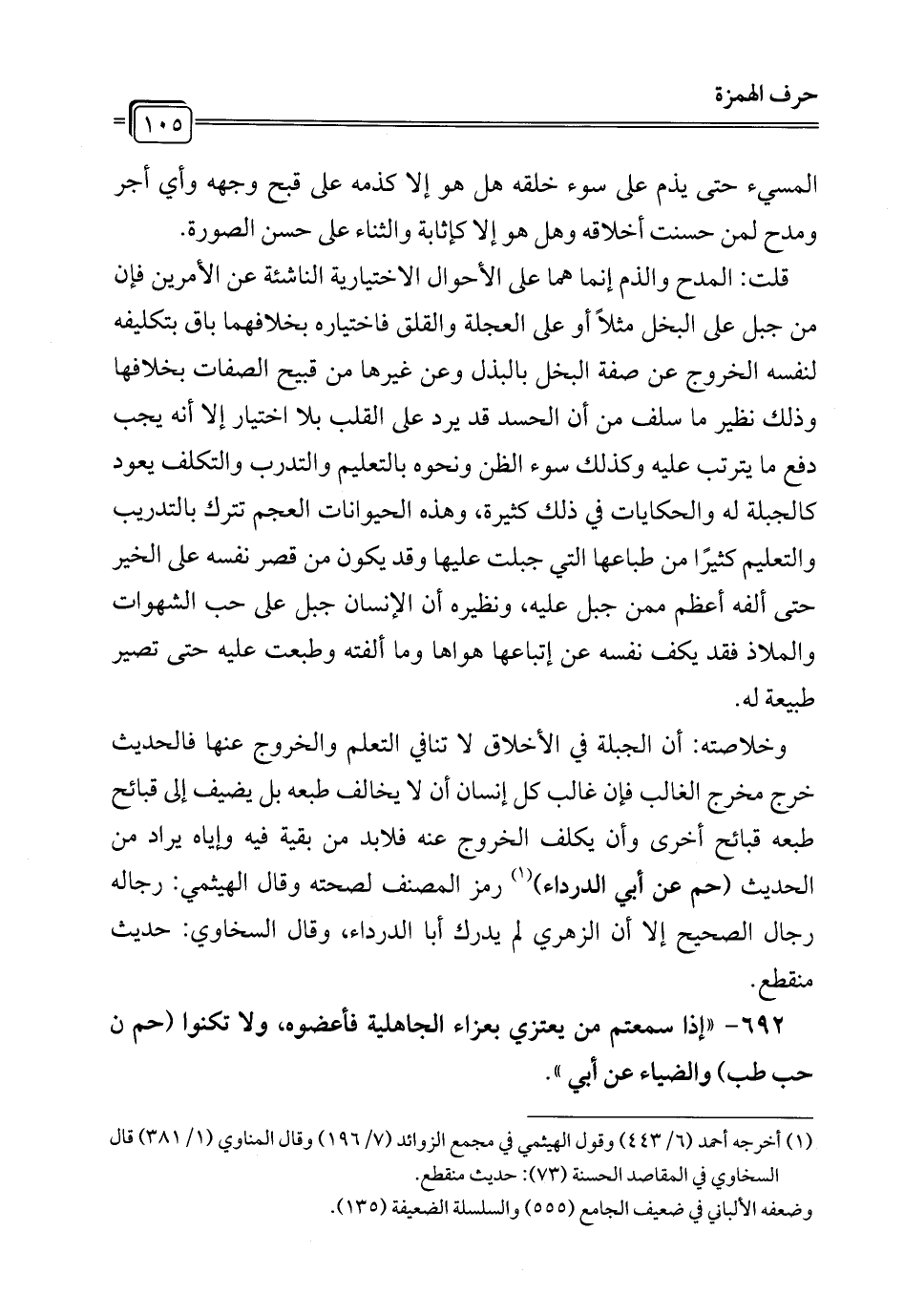 قلت: المدح والذم إنما هما على الأحوال الاختيارية الناشئة عن الأمرين فإن من جبل على البخل مثلاً أو على العجلة والقلق فاختياره بخلافهما باق بتكليفه لنفسه الخروج عن صفة البخل بالبذل وعن غيرها من قبيح الصفات بخلافها وذلك نظير ما سلف من أن الحسد قد يرد على القلب بلا اختيار إلا أنه يجب دفع ما يترتب عليه وكذلك سوء الظن ونحوه بالتعليم والتدرب والتكلف يعود كالجبلة له والحكايات في ذلك كثيرة، وهذه الحيوانات العجم تترك بالتدريب والتعليم كثيرًا من طباعها التي جبلت عليها وقد يكون من قصر نفسه على الخير حتى ألفه أعظم ممن جبل عليه، ونظيره أن الإنسان جبل على حب الشهوات والملاذ فقد يكف نفسه عن إتباعها هواها وما ألفته وطبعت عليه حتى تصير طبيعة له.