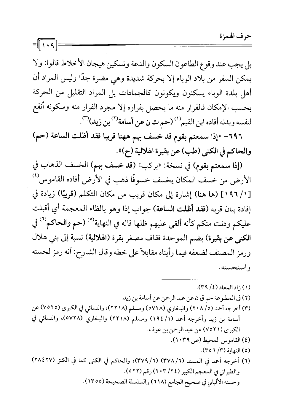 بل يجب عند وقوع الطاعون السكون والدعة وتسكين هيجان الأخلاط قالوا: ولا يمكن السفر من بلاد الوباء إلا بحركة شديدة وهي مضرة جدًا وليس المراد أن أهل بلدة الوباء يسكنون ويكونون كالجمادات بل المراد التقليل من الحركة بحسب الإمكان فالفرار منه ما يحصل بفراره إلا مجرد الفرار منه وسكونه أنفع لنفسه وبدنه أفاده ابن القيم (¬1) (حم ت ن عن أسامة (¬2) بن زيد) (¬3).