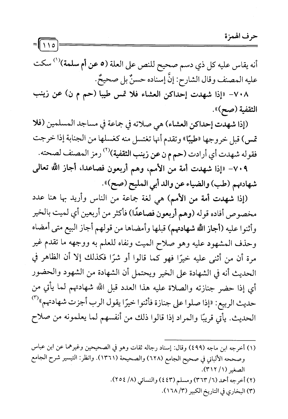 708 - " إذا شهدت إحداكن العشاء فلا تمس طيبا (حم م ن) عن زينب الثقفية (صح) ".
