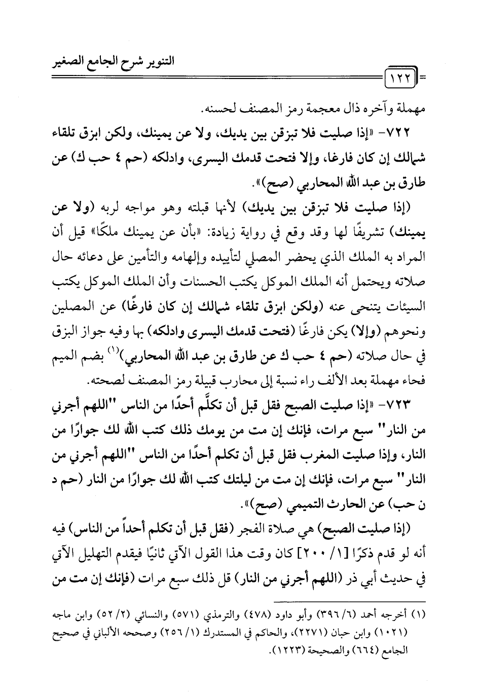 723 - " إذا صليت الصبح فقل قبل أن تكلَّم أحدًا من الناس "اللهم أجرني من النار" سبع مرات، فإنك إن مت من يومك ذلك كتب الله لك جوارًا من النار، وإذا صليت المغرب فقل قبل أن تكلم أحدًا من الناس "اللهم أجرني من النار" سبع مرات، فإنك إن مت من ليلتك كتب الله لك جوارًا من النار (حم د ن حب) عن الحارث التميمي (صح) ".
