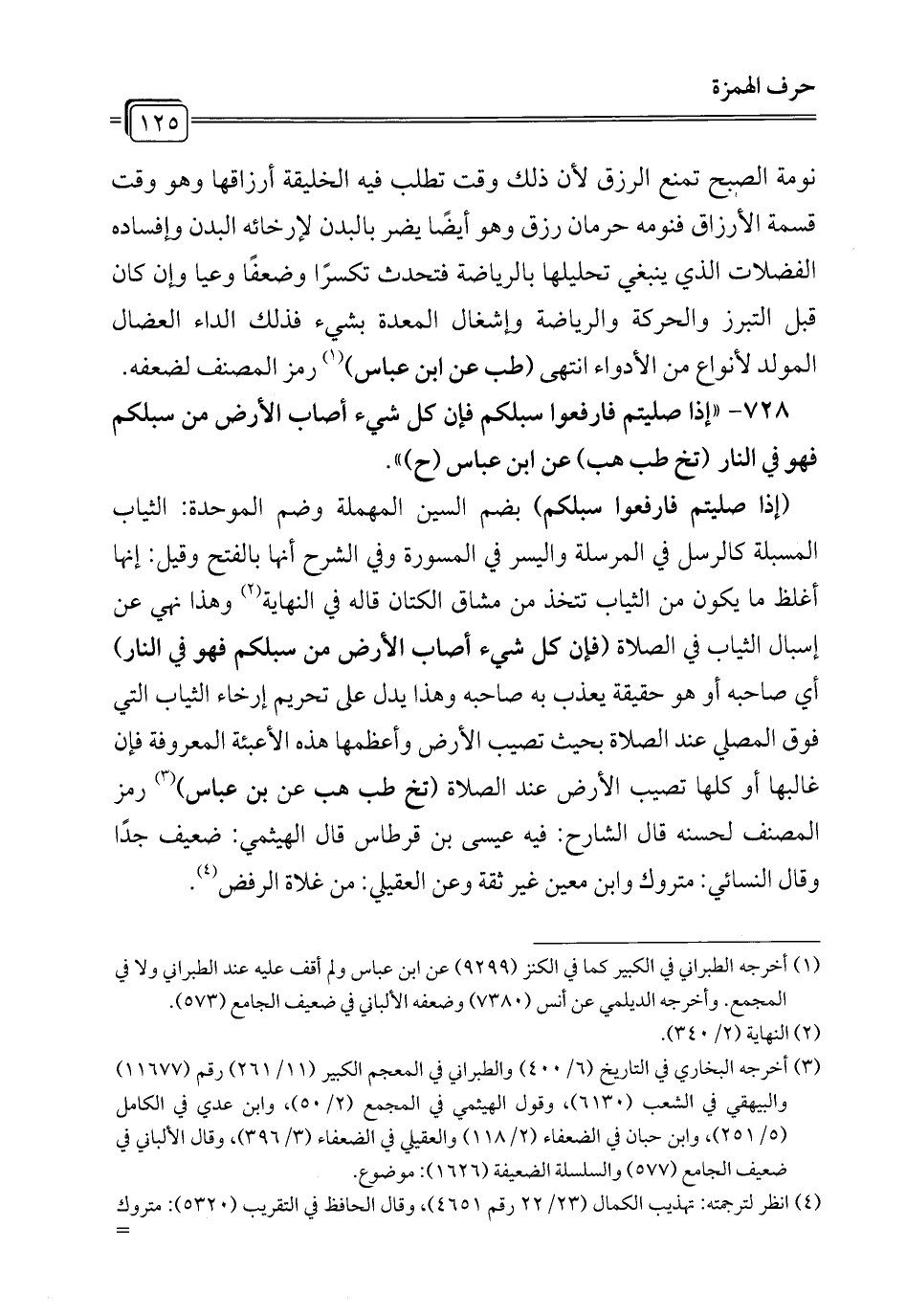 728 - " إذا صليتم فارفعوا سبلكم فإن كل شيء أصاب الأرض من سبلكم فهو في النار (تخ طب هب) عن ابن عباس (ح) ".