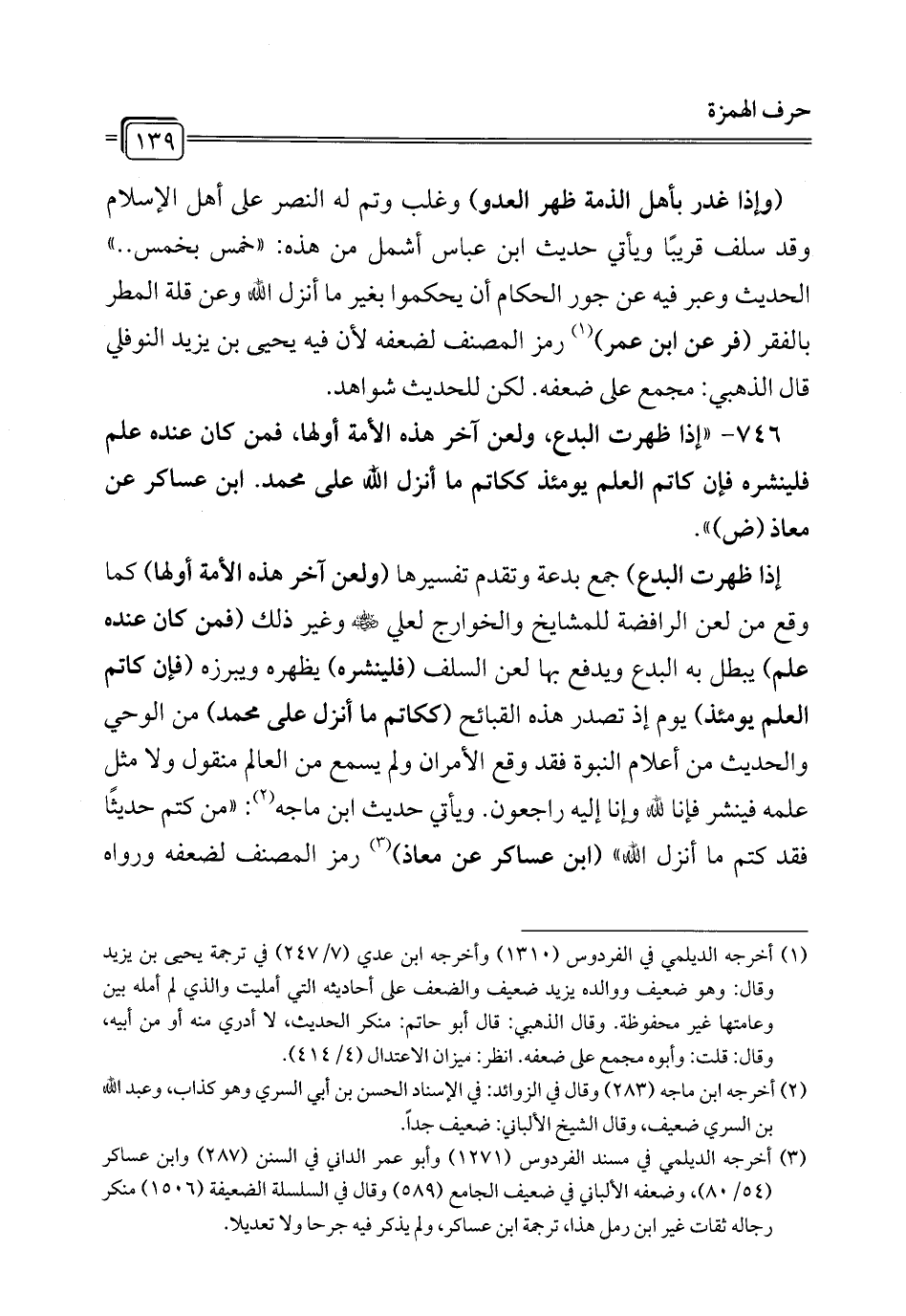746 - " إذا ظهرت البدع، ولعن آخر هذه الأمة أولها، فمن كان عنده علم فلينشره فإن كاتم العلم يومئذ ككاتم ما أنزل الله على محمَّد. ابن عساكر عن معاذ (ض) ".