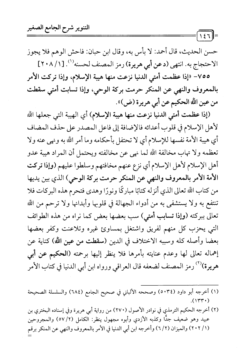 (إذا عظمت أمتي الدنيا نزعت منها هيبة الإِسلام) أي الهيبة التي جعلها الله لأهل الإِسلام في قلوب أعدائه فالإضافة إلى فاعل المصدر على حذف المضاف أي هيبة الأمة نفسها للإسلام أي لا تحتفل بأحكامه وما أمر الله به ونهى عنه ولا تعظمه ولا تهاب مخالفة الله لما نهى عن مخالفته ويحتمل أن المراد هيبة عدو أهل الإِسلام لأهل الإِسلام أي نزع عنهم مخافتهم وسلطوا عليهم (وإذا تركت الأمة الأمر بالمعروف والنهي عن المنكر حرمت بركة الوحي) الذي بين يديها من كتاب الله تعالى الذي أنزله كتابًا مباركًا ونورًا وهدى فتحرم هذه البركات فلا تنتفع به ولا يستشفى به من أدواء الجهالة في قلوبها وأبدانها ولا ترحم من الله تعالى ببركته (وإذا تسابب أمتي) سب بعضها بعض كما نراه من هذه الطوائف التي يحزب كل منهم لفريق واشتغل بمساوئ غيره وتلاعنت وكفر بعضها بعضا وأصله كله وسببه الاختلاف في الدين (سقطت من عين الله) كناية عن إهماله تعالى لها وعدم عنايته بأمرها فلا ينظر إليها برحمته (الحكيم عن أبي هريرة) (¬2) رمز المصنف لضعفه قال العراقي ورواه ابن أبي الدنيا في كتاب الأمر