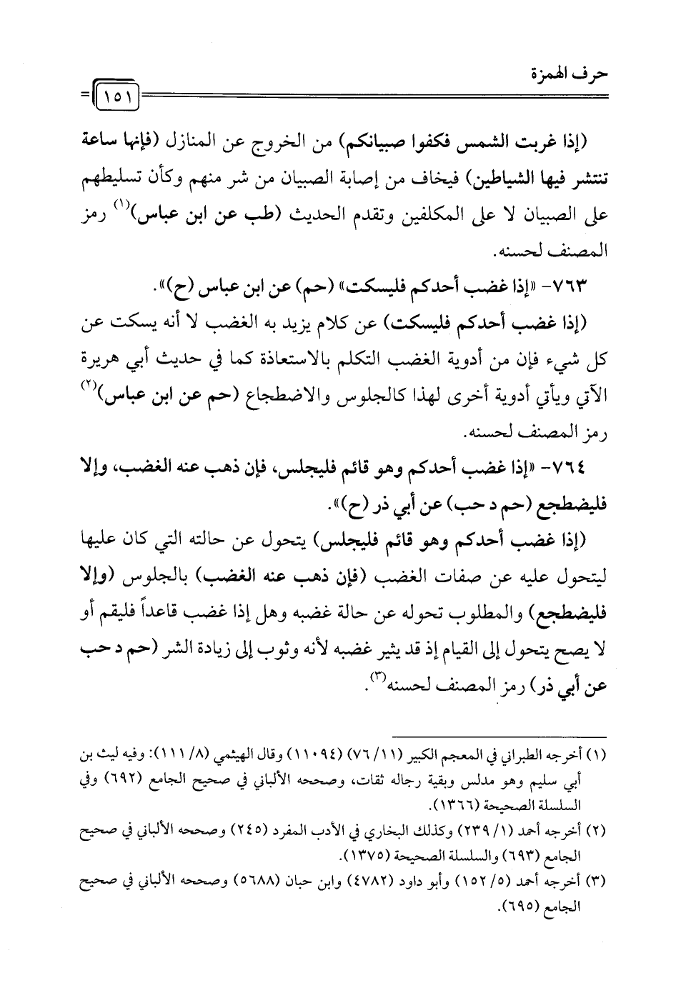 764 - " إذا غضب أحدكم وهو قائم فليجلس، فإن ذهب عنه الغضب، وإلا فليضطجع (حم د حب) عن أبي ذر (ح) ".
