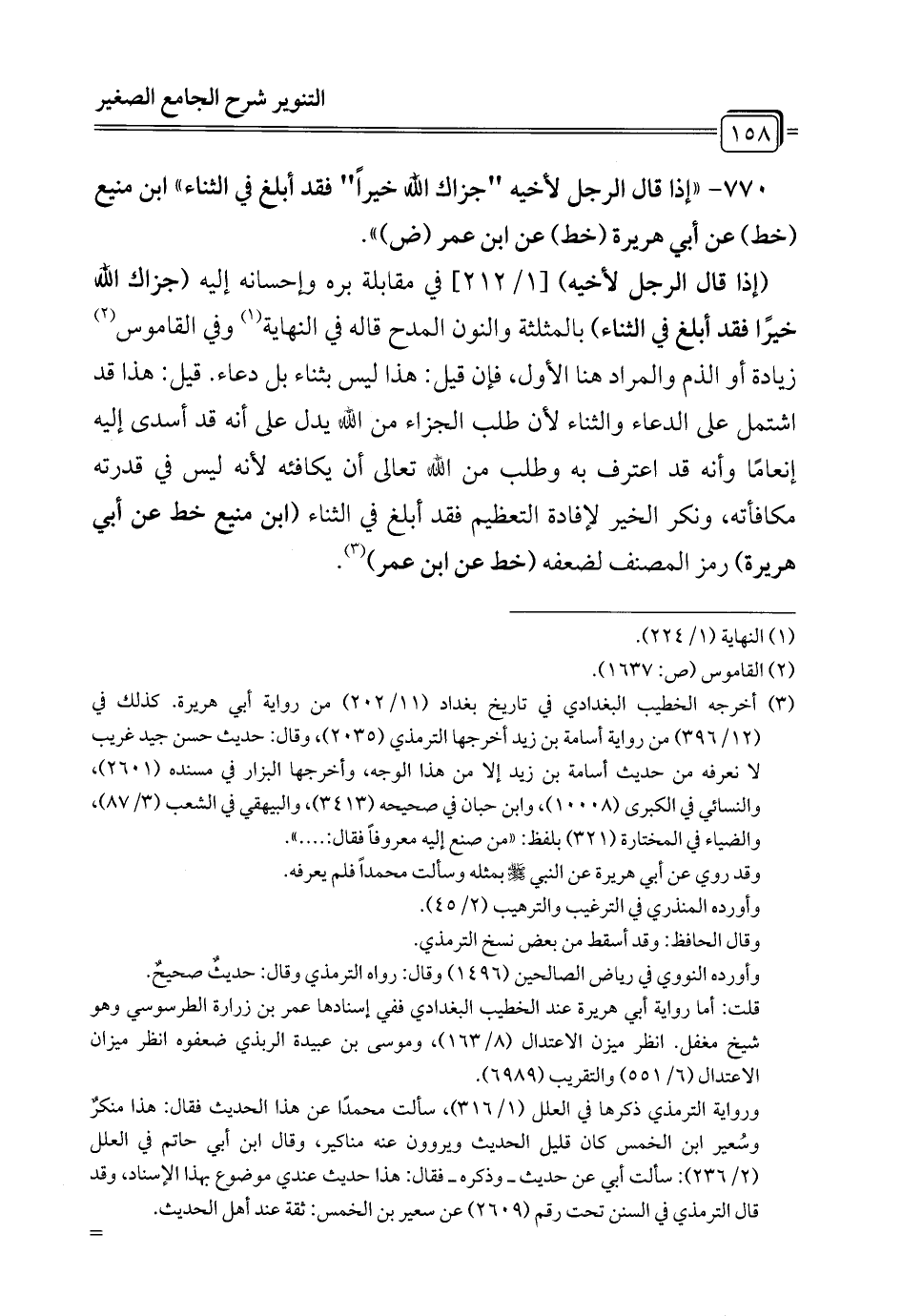 770 - " إذا قال الرجل لأخيه "جزاك الله خيراً" فقد أبلغ في الثناء" ابن منيع (خط) عن أبي هريرة (خط) عن ابن عمر (ض) ".