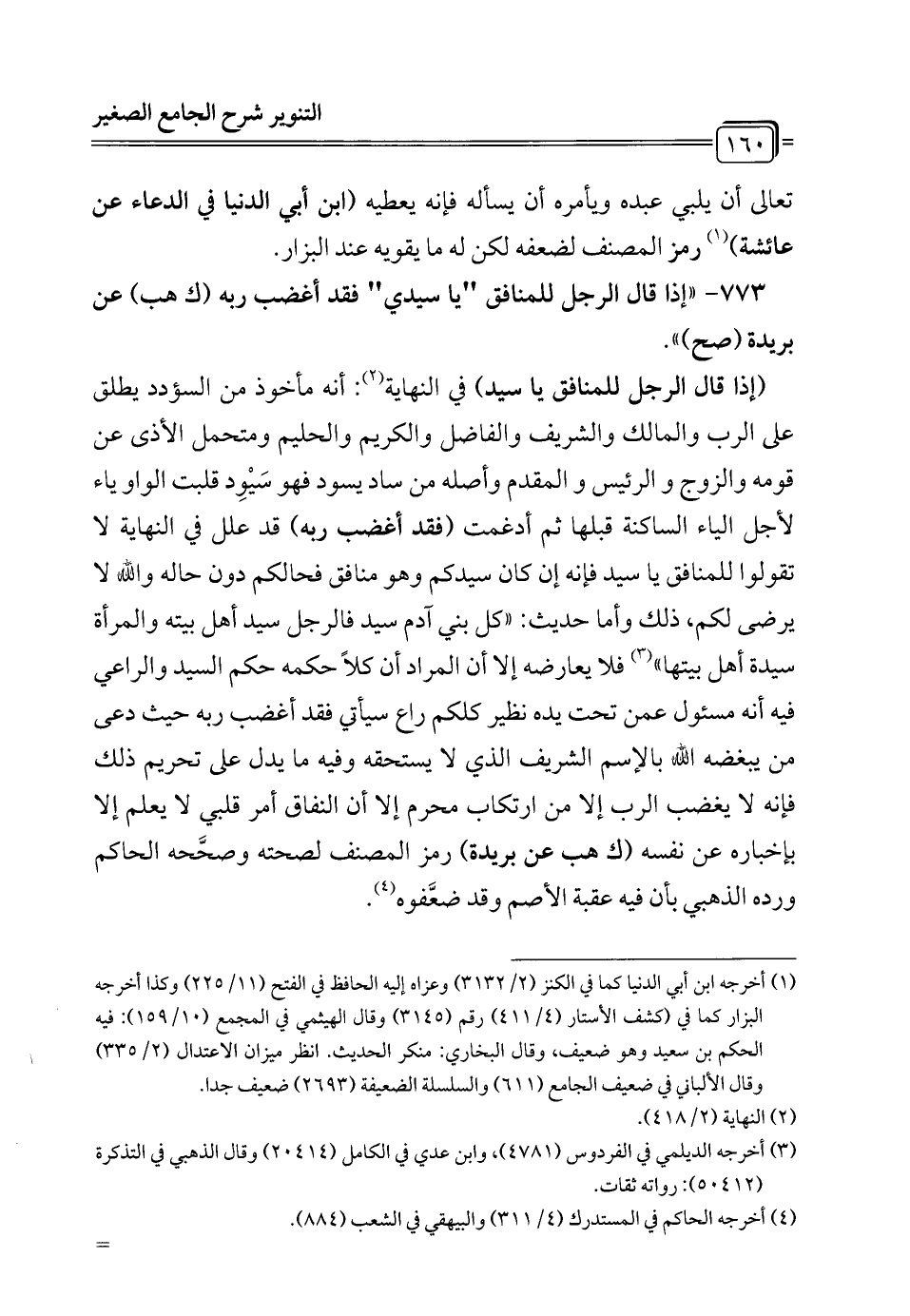 773 - " إذا قال الرجل للمنافق "يا سيدي" فقد أغضب ربه (ك هب) عن بريدة (صح) ".