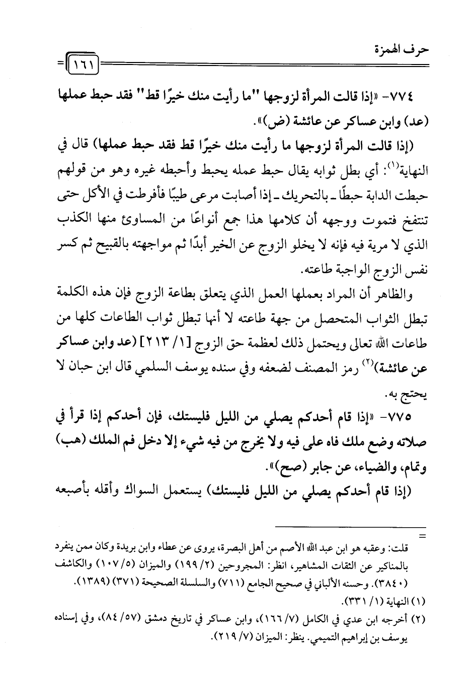 774 - " إذا قالت المرأة لزوجها "ما رأيت منك خيرًا قط" فقد حبط عملها (عد) وابن عساكر عن عائشة (ض) ".