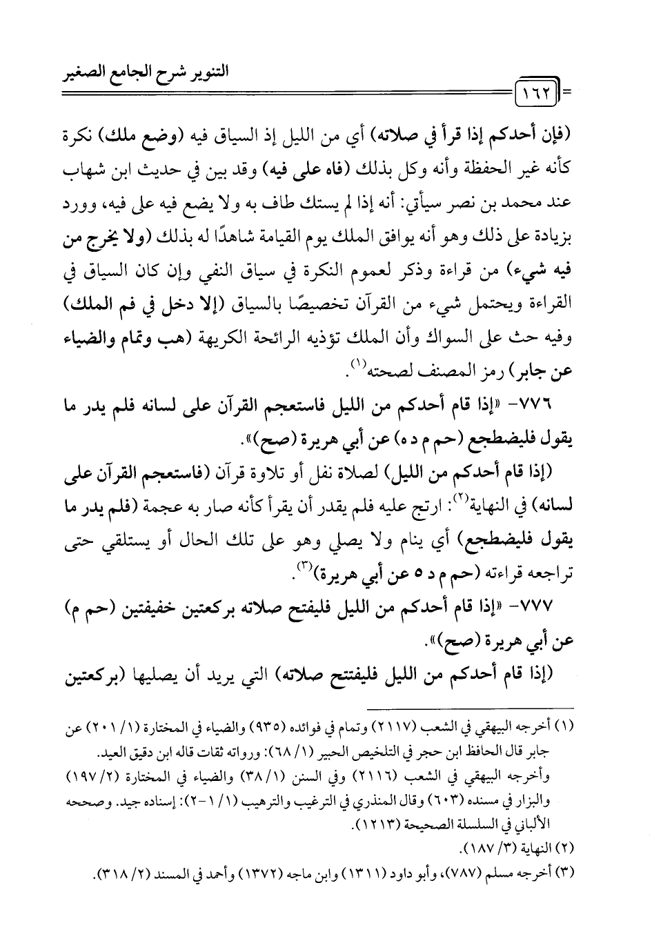 777 - " إذا قام أحدكم من الليل فليفتح صلاته بركعتين خفيفتين (حم م) عن أبي هريرة (صح) ".