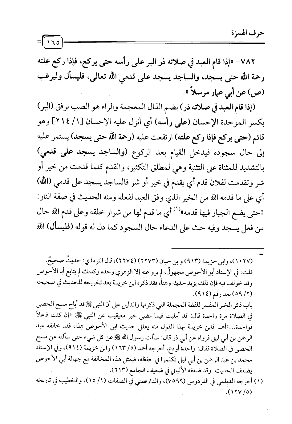 782 - " إذا قام العبد في صلاته ذر البر على رأسه حتى يركع، فإذا ركع علته رحمة الله حتى يسجد، والساجد يسجد على قدمي الله تعالى، فليسأل وليرغب (ص) عن أبي عمار مرسلاً".