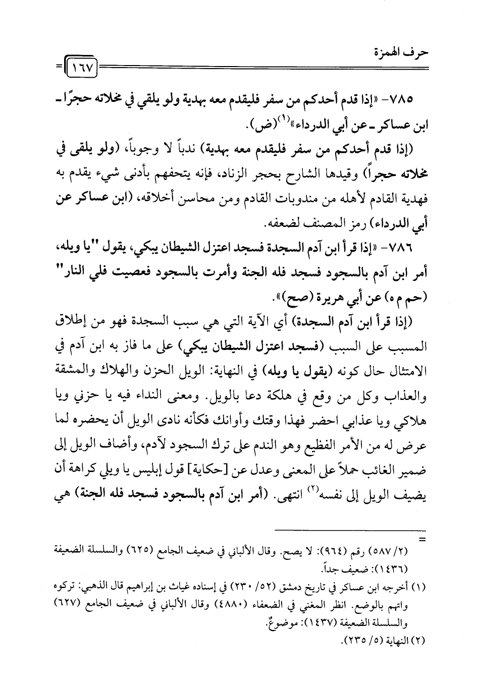 786 - " إذا قرأ ابن آدم السجدة فسجد اعتزل الشيطان يبكي، يقول "يا ويله، أمر ابن آدم بالسجود فسجد فله الجنة وأمرت بالسجود فعصيت فلي النار" (حم م هـ) عن أبي هريرة (صح) ".