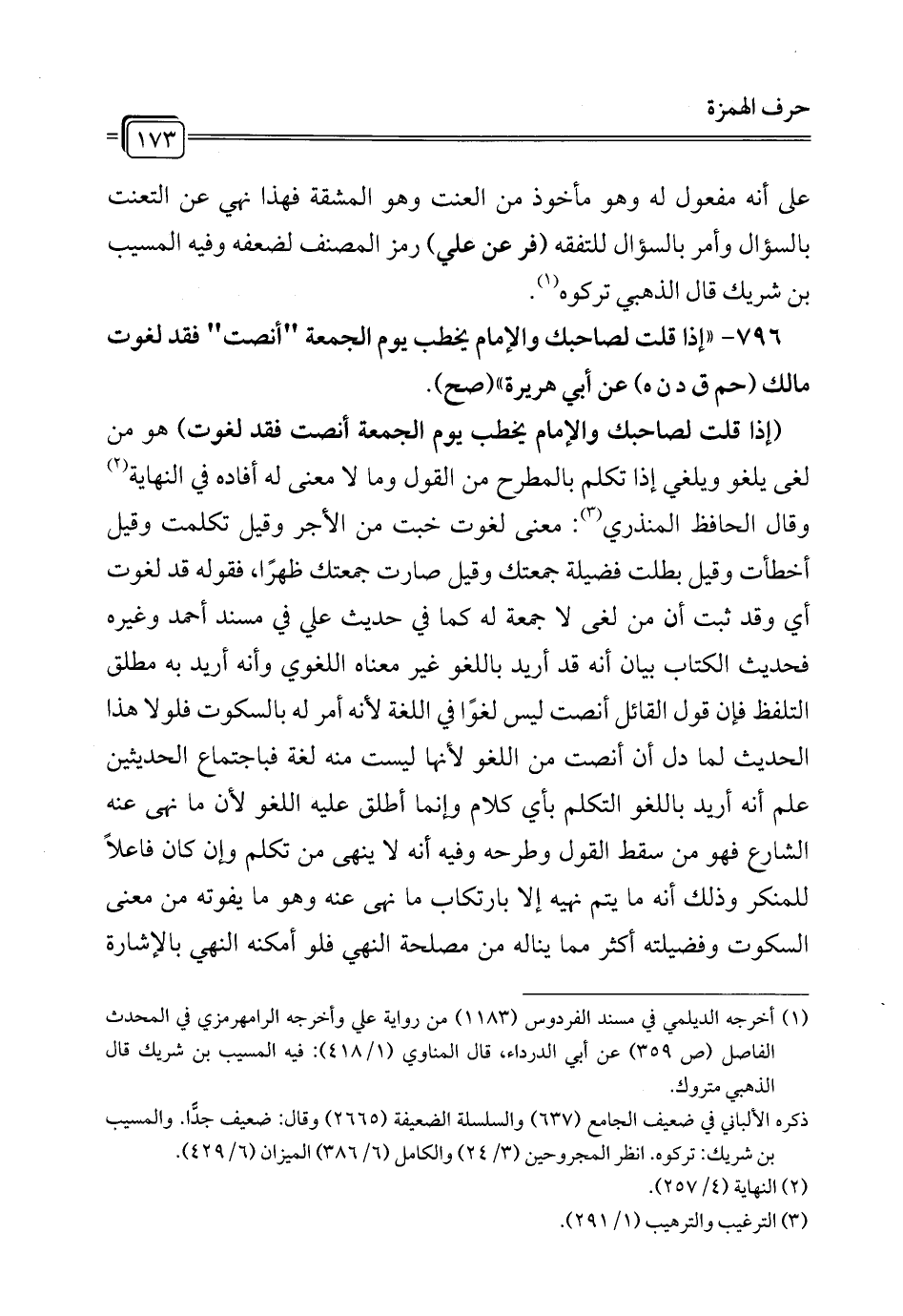 796 - " إذا قلت لصاحبك والإمام يخطب يوم الجمعة "أنصت" فقد لغوت مالك (حم ق د ن هـ) عن أبي هريرة" (صح).