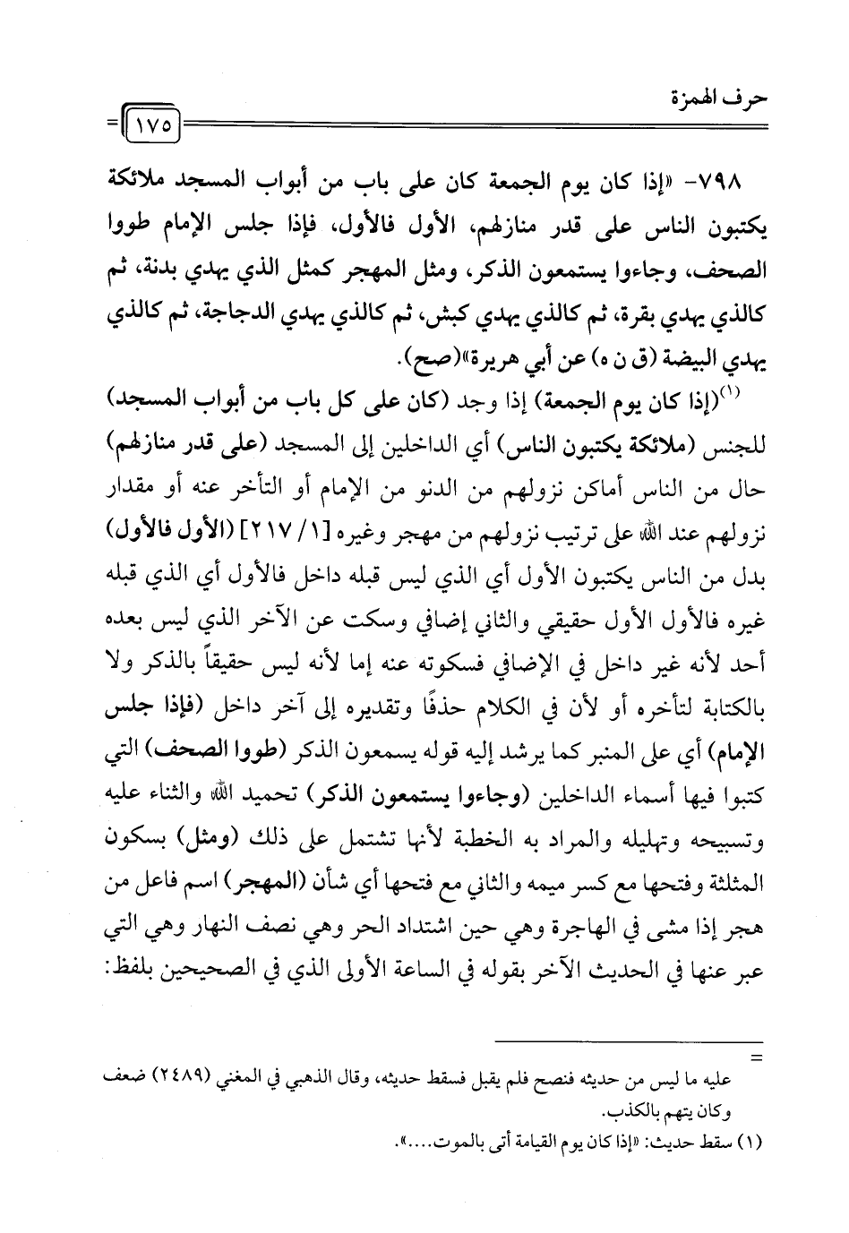 798 - " إذا كان يوم الجمعة كان على باب من أبواب المسجد ملائكة يكتبون الناس على قدر منازلهم، الأول فالأول، فإذا جلس الإِمام طووا الصحف، وجاءوا يستمعون الذكر، ومثل المهجر كمثل الذي يهدي بدنة, ثم كالذي يهدي بقرة، ثم كالذي يهدي كبش، ثم كالذي يهدي الدجاجة، ثم كالذي يهدي البيضة (ق ن هـ) عن أبي هريرة" (صح).