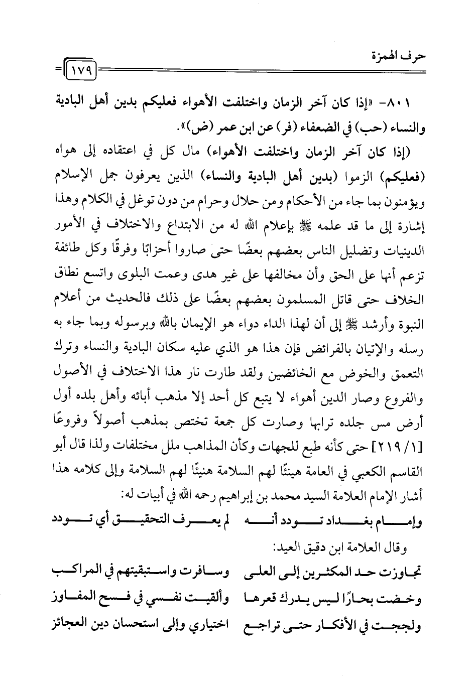 801 - " إذا كان آخر الزمان واختلفت الأهواء فعليكم بدين أهل البادية والنساء (حب) في الضعفاء (فر) عن ابن عمر (ض) ".