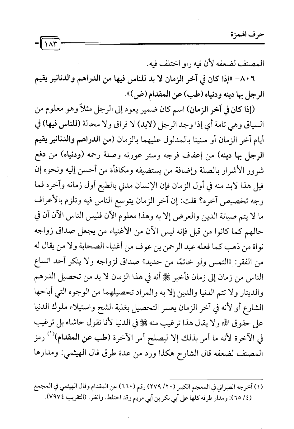 806 - " إذا كان في آخر الزمان لا بد للناس فيها من الدراهم والدنانير يقيم الرجل بها دينه ودنياه (طب) عن المقدام (ض) ".